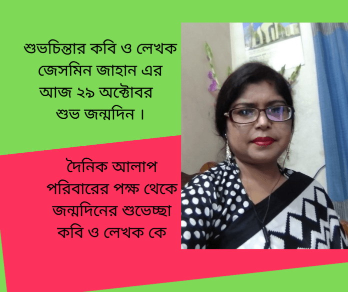 দৈনিক আলাপ ওয়েবডেস্কঃ সাহিত্যের অন্যতম সারথি কবি ও লেখক জেসমিন জাহান এর আজ শুভ জন্মদিন । দৈনিক আলাপ পরিবারের পক্ষ থেকে জন্মদিনের শুভেচ্ছা কবি ও লেখক কে ।