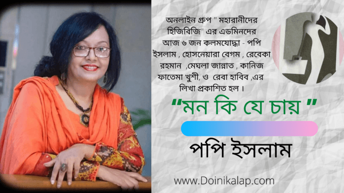 অনলাইন গ্রুপ ” মহারানীদের হিজিবিজি” এর এডমিনদের আজ ৬ জন কলমযোদ্ধা – পপি ইসলাম , হোসনেয়ারা বেগম , রেবেকা রহমান ,মেঘলা জান্নাত , কানিজ ফাতেমা খুশী, ও রেবা হাবিব ,এর লিখা প্রকাশিত হল।“মন কি যে চায় ”কবিতাটি লিখেছেন বাংলা সাহিত্যের অন্যতম সারথি-পপি ইসলাম