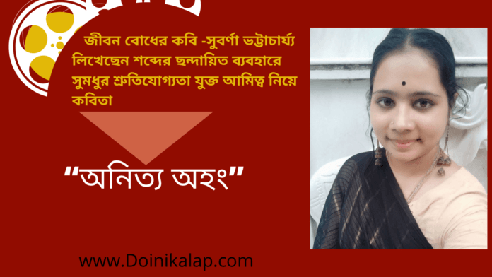 জীবন বোধের কবি সুবর্ণা ভট্টাচার্য্য লিখেছেন শব্দের ছন্দায়িত ব্যবহারে সুমধুর শ্রুতিযোগ্যতা যুক্ত আমিত্ব নিয়ে কবিতা “অনিত্য অহং”