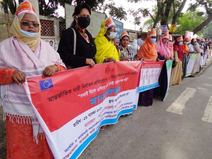 আটঘয়িা(পাবনা) প্রতিনিধি : আটঘরিয়া (পাবনা) আমরাই পারি উপজেলা নাগরিক জোটের আয়োজনে আন্তর্জাতিক নারী নির্যাতন প্রতিরোধ দিবসে উপলক্ষে প্রতিপাদ্য ‘‘কমলা রঙের বিশ্বে নারী-বাধার পথ দেবেই পাড়ি” এবং ‘‘সবাই মিলে এগিয়ে চলি, নারী নির্যাতন বন্ধ করি”শ্লোগান কে সামনে রেখে বৃহষ্পতিবার ২৬ নভেম্বর দুপুরে পাবনার আটঘরিয়ায় আন্তর্জাতিক নারী নির্যাতন প্রতিরোধে ১৬দিনের পক্ষকাল ব্যাপী কর্মসূচী উপলক্ষে আলোচনা সভা ও মানববন্ধন অনুষ্ঠিত হয়েছে।
