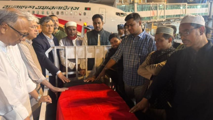 এর আগে শুক্রবার (১৯ ডিসেম্বর) সন্ধ্যা ৫টা ৫০ মিনিটে লাল-সবুজের কফিনে মোড়ানো হাদির মরদেহ সিঙ্গাপুর থেকে ঢাকার হযরত শাহজালাল আন্তর্জাতিক বিমানবন্দরে পৌঁছায়।