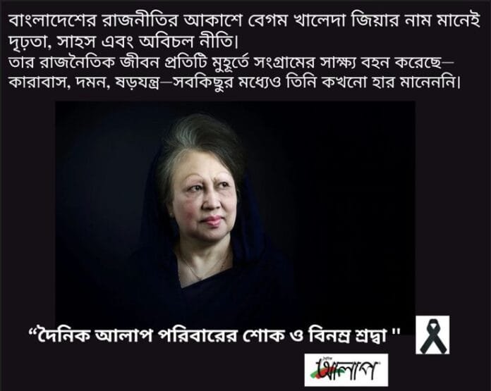 দৈনিক আলাপ ওয়েবডেস্ক: বাংলাদেশের সাবেক প্রধানমন্ত্রী ও বাংলাদেশ জাতীয়তাবাদী দল (বিএনপি)-এর চেয়ারপারসন বেগম খালেদা জিয়ার ইন্তেকালে আমরা গভীরভাবে শোকাহত ও মর্মাহত। তাঁর মৃত্যু রাষ্ট্র ও জাতির জন্য এক অপূরণীয় ক্ষতি।