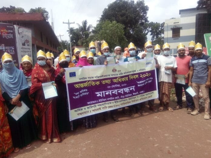 ঈশ্বরদী প্রতিনিধি :ইউরোপিয়ান ইউনিয়ন নেট্জ বাংলাদেশ এর আর্থিক ও কারিগরি সহযোগিতায় এবং আমরাই পারি পারিবারিক নির্যাতন প্রতিরোধ জোট এর বাস্তবায়নে ‘তথ্য অধিকার সংকটে হাতিয়ার’ প্রতিপাদ্য নিয়ে আন্তর্জাতিক তথ্য অধিকার দিবস ২০২০ পালিত হয়েছে। ”সংকটকালে তথ্য পেলে জনগনের মুক্তি মেলে” এই স্লোগান কে সামনে নিয়ে পাবনার ঈশ্বরদী উপজেলার সাঁড়া ইউনিয়ন নাগরিক জোটের আয়োজনে ২৯/৯/২০২০ মঙ্গলবার সকালে আন্তর্জাাতিক তথ্য দিবস উপলক্ষে মানববন্ধন অনুষ্ঠিত হয়েছে।