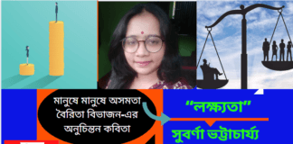 মানুষে মানুষে অসমতা বৈরিতা বিভাজন-এর অনুচিন্তন কবিতা ‘লক্ষ্যতা’ লিখেছেন সুবর্ণা ভট্টাচার্য্য।
